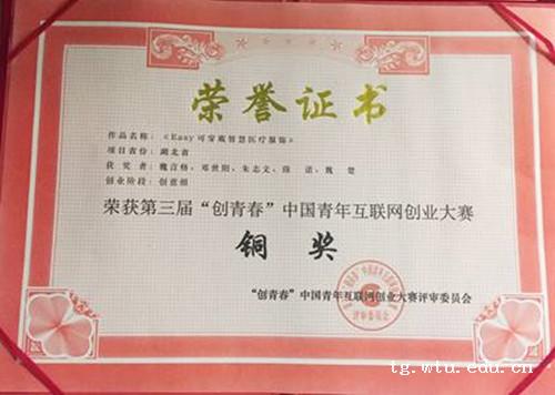 学生魏言格等的《Easy智能矫正服装》项目荣获第三届“创青春“中国青年互联网创业大赛铜奖。