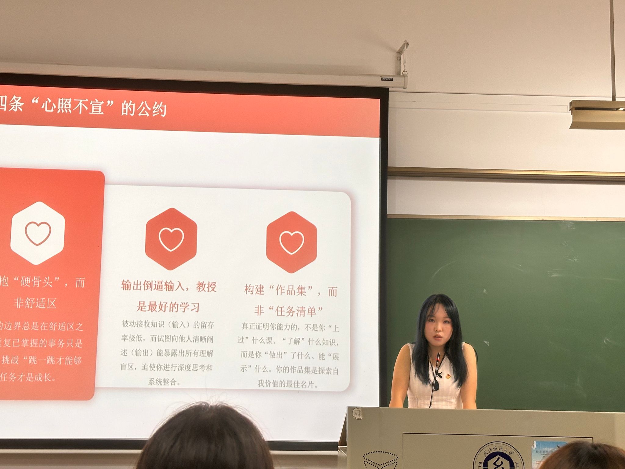 此外,活动还特别关注新生的心理健康与人文素养。陈君怡等同学聚焦大学生心理健康主题,分享了压力调适、情绪管理与人际沟通等方面的实用技巧,倡导积极健康的学习生活方式。徐思琪等同学则围绕“党的理论我来讲”,将宏大主题与大学生发展相结合,重点围绕“九三阅兵”精神等主题,阐释坚韧不拔的学习态度与家国情怀的内在联系,提升新生的思想认同与综合素养。