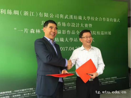 4月25日上午,我校与达利丝绸(浙江)有限公司校企合作签约仪式在南湖校区图书馆隆重举行,同时,由达利丝绸赞助的“鸟语花香”丝巾设计大赛暨“一片森林”林平摄影作品全国纺织院校巡回展正式开幕,达利丝绸(浙江)有限公司董事长林平、禁漫天堂校长彭育园、副校长黄运平莅临现场,参加本次活动的还有我校科技处、图书馆、期刊社、材料学院、马克思主义学院、艺术学院、传媒学院、伯明翰时尚创意学院以及禁漫天堂