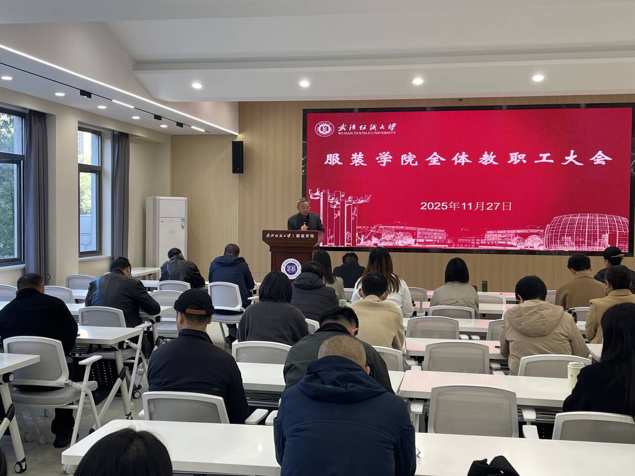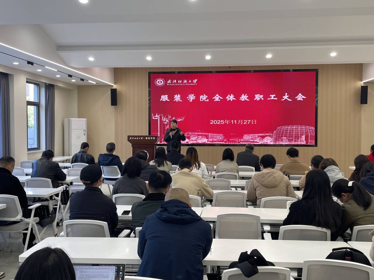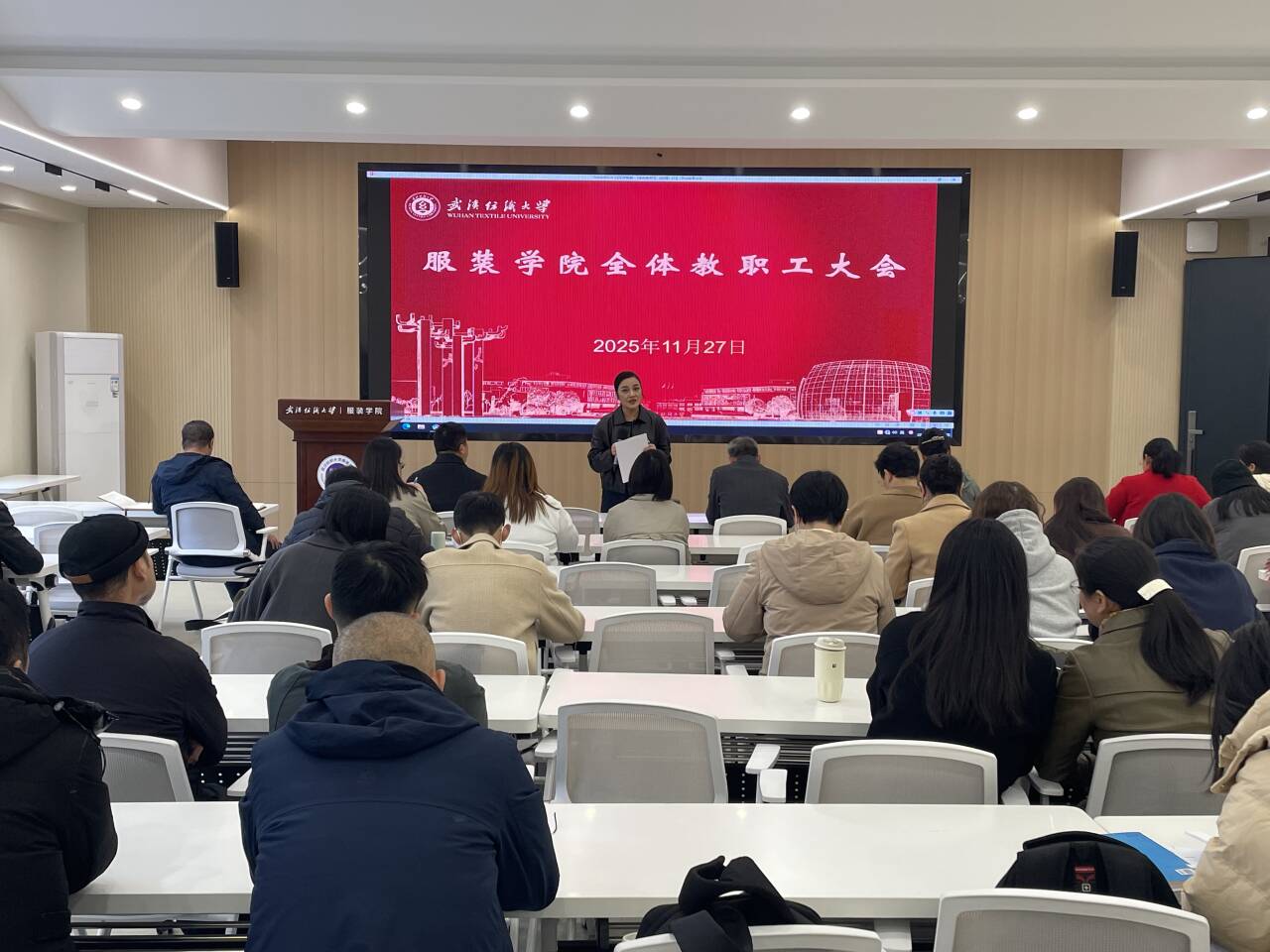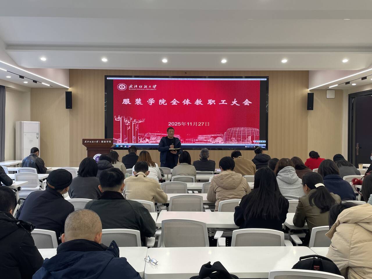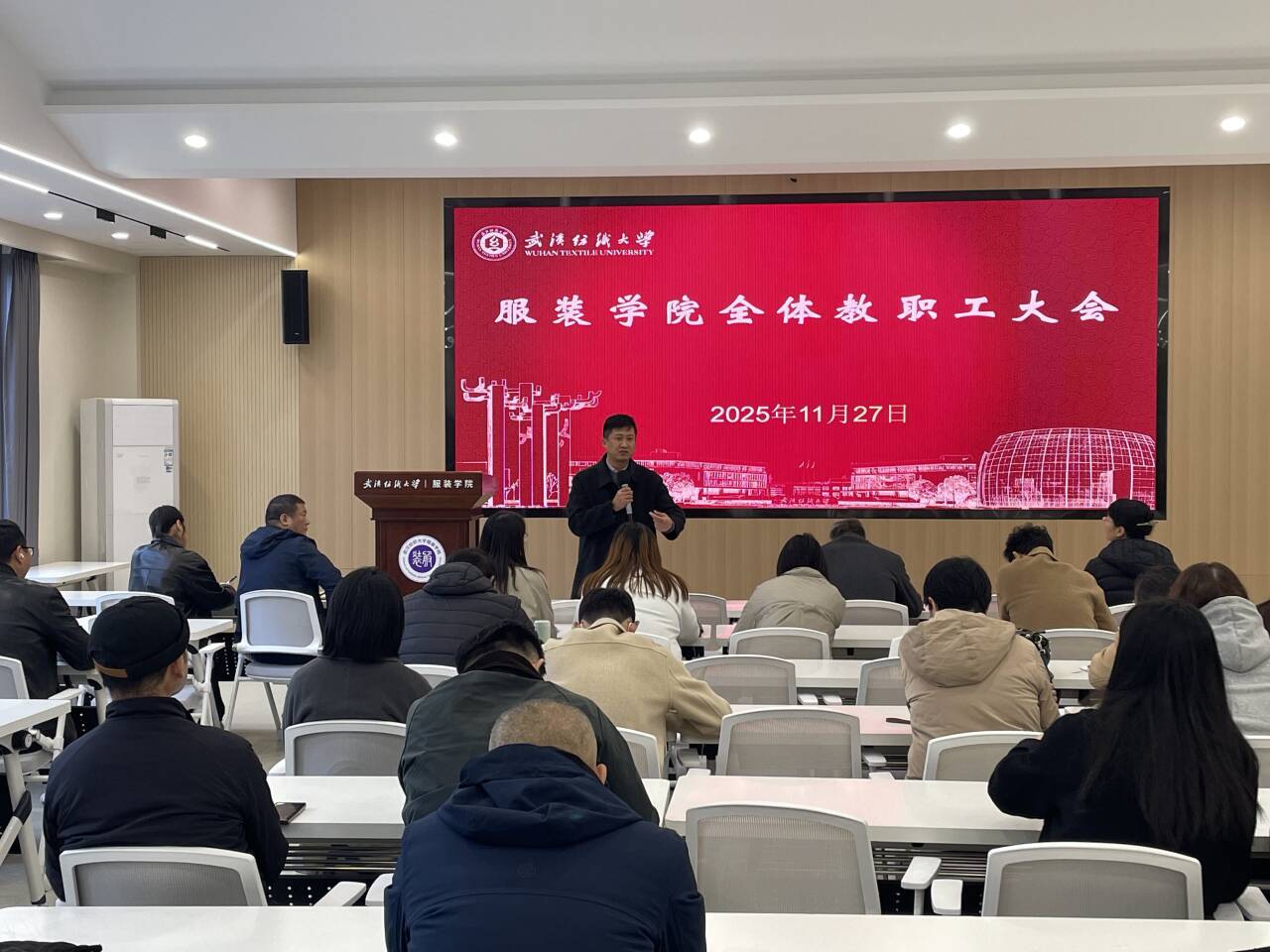 在综合楼二楼学术报告厅召开全院教职工大会,学院领导班子成员及全体教职工参会。会议由院长陶辉主持,聚焦教学科研、人才培养、毕业生就业以及学生安全稳定等核心工作,系统部署近期重点任务,强化责任落实,为学院高质量发展和学校 “双一流” 建设筑牢根基。