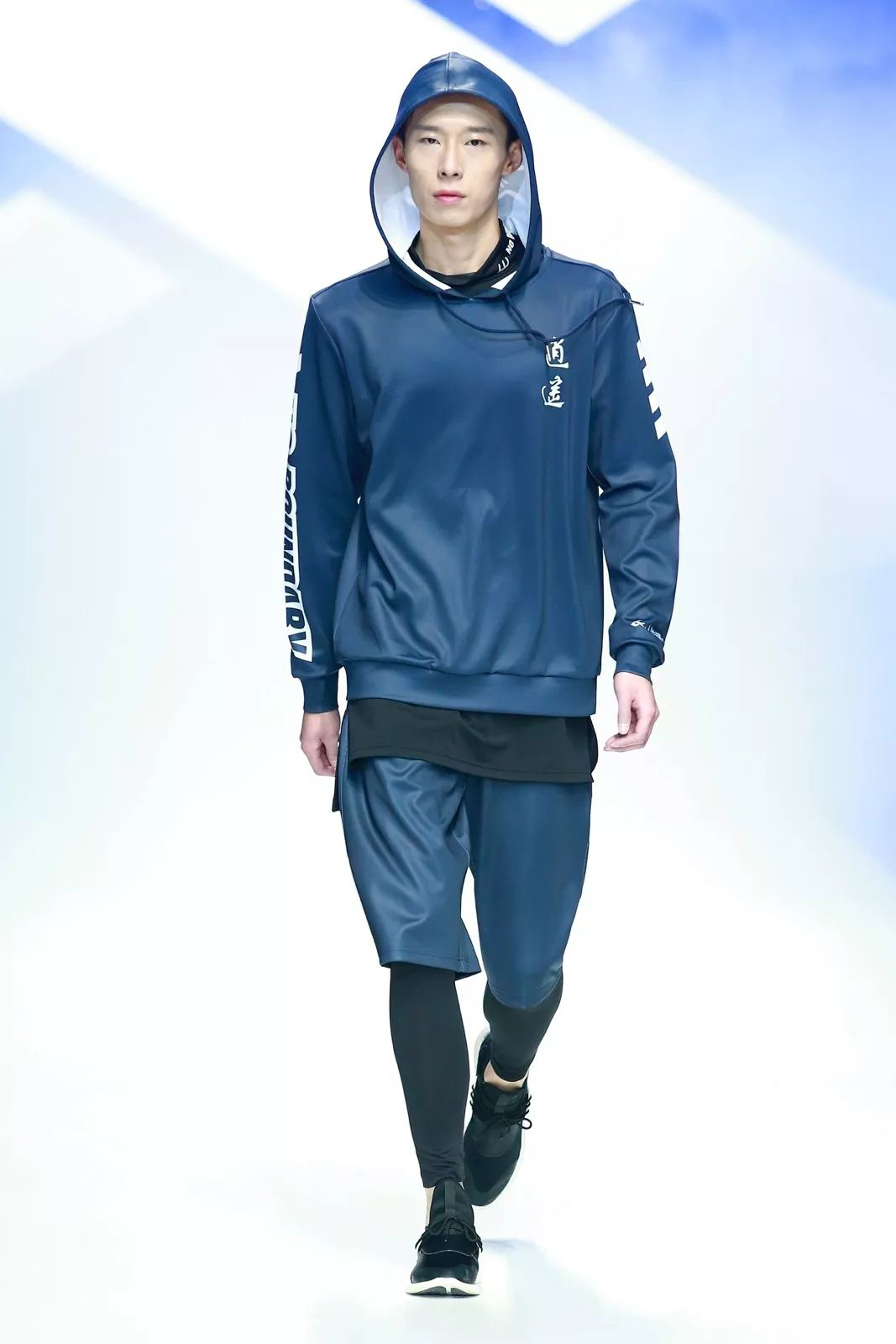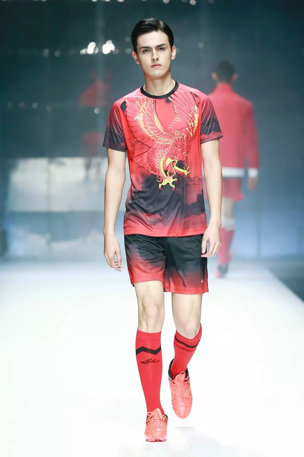 本次发布的作品共两个系列45套,分为足球系列与运动生活系列。足球系列中延续了黄老师多年来对于运动装备设计的深入理解与精湛技巧,呈现出将功能性与时尚性完美融合的运动单品;运动生活系列则是重点演绎方向,他将富有传统意味的鲲鹏图案、水墨山水等元素与LOGO结构巧妙融合,简约不失趣味,时尚更具韵致。在色彩上采用了群青、大红、明黄、月白等中国传统色彩,将千年历史的古老色彩注入前所未有的运动活力。高科技面料也是此次发布会的亮点之一,采用了“石墨烯像景提花+对位印花”系列面料,该系列产品结合石墨烯材料天然色泽,以石墨烯材质“高级灰”本色勾勒花型轮廓,纱线无需染色,生态环保,结合花型设计,可以使产品形成双面双色风格,触感柔滑,新颖时尚。