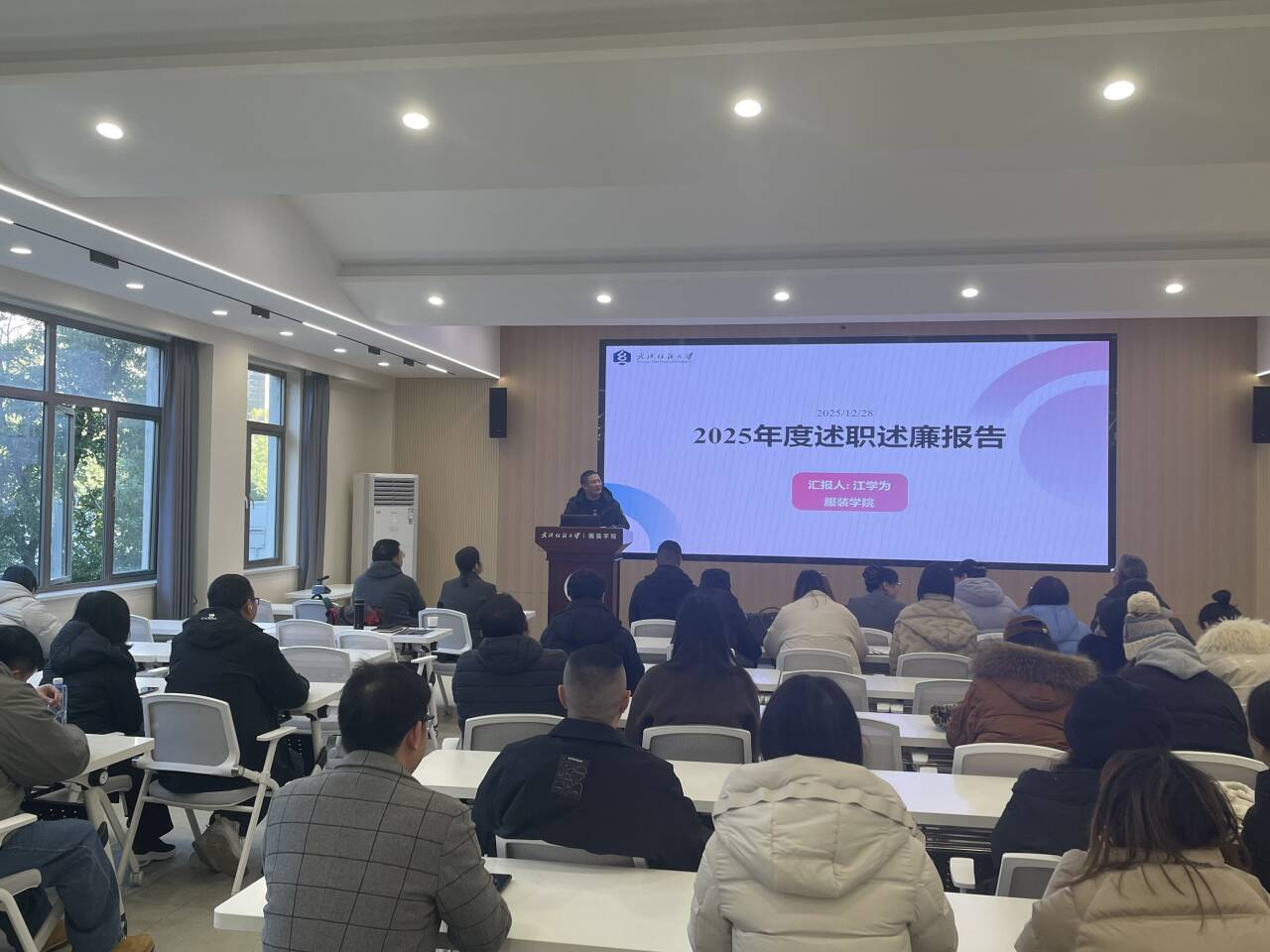2025 年度领导班子述职述廉暨民主测评大会在学院二楼学术报告厅顺利召开。学院全体领导班子成员、教职工参加会议,研工部部长刘欣主持会议。会议严格遵循学校年度考核工作规范,以 "德、能、勤、绩、廉" 五项标准为核心,.对照“美好纺大”实践篇提出的个人“3+N”项重点工作任务清单完成情况,全面复盘学院 2025 年度工作成效。