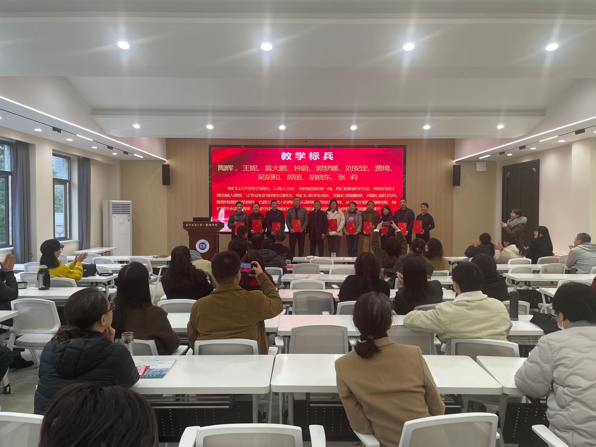 随后,学院对2025年度科研标兵、教学标兵、服务标兵和特殊贡献标兵进行了表彰。学院党委书记杜新年和院长陶辉为获奖教职工颁奖,勉励全体教职工以标兵为榜样,锐意进取、争先创优,在各自岗位上再创佳绩。