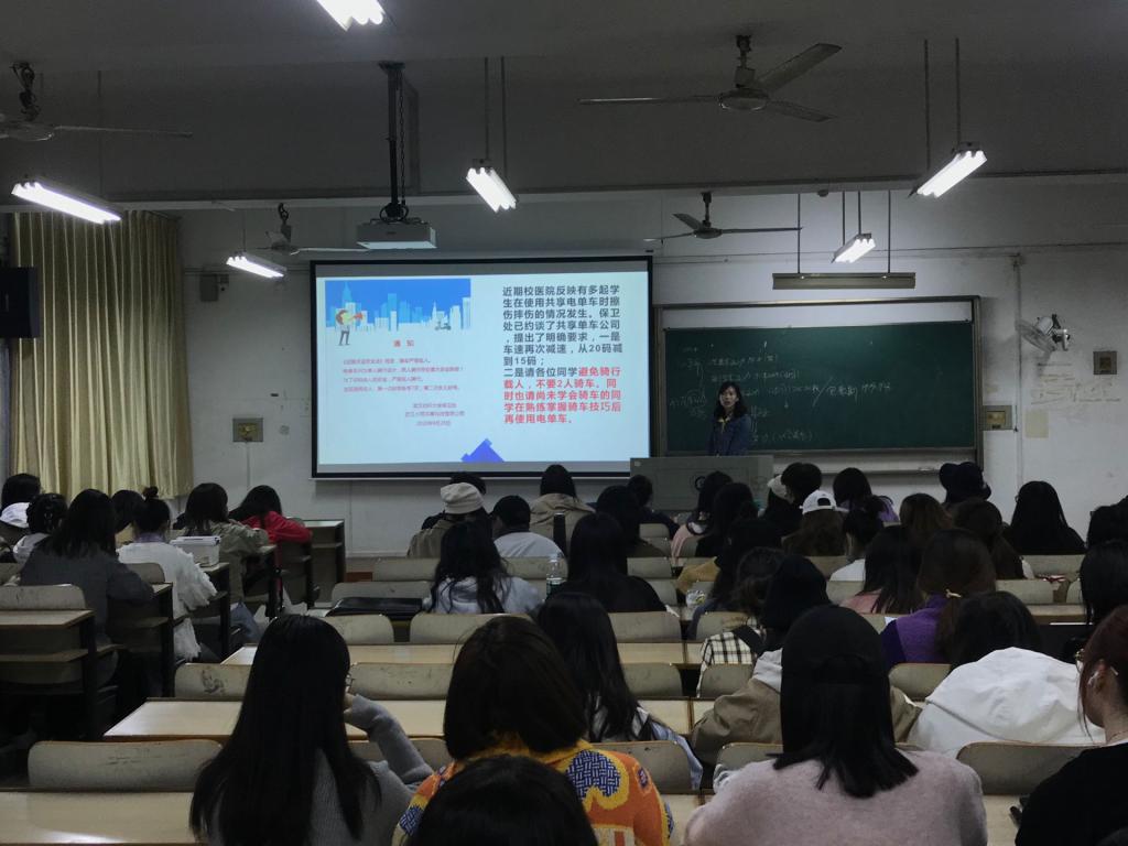 辅导员夏菡老师首先通报了近期校园安全文明情况,传达学校《关于严禁共享电单车载人的通知》,要求同学们严格按照学校规定使用共享电车,积极营造安全和谐的校园环境。