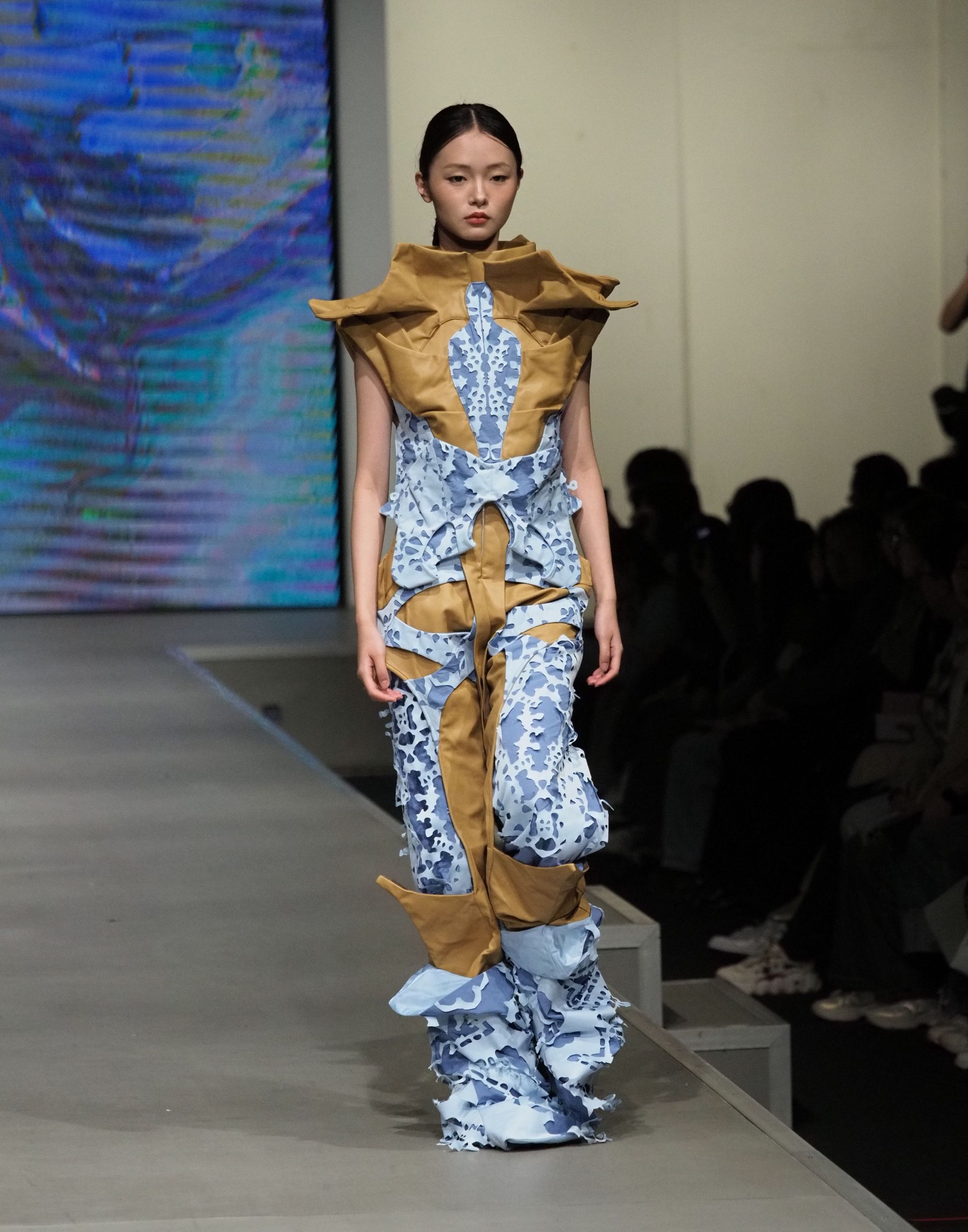 在全部的服装设计作品里,毕业生们的作品深度融合非遗活化、AI设计、3D打印、智能面料等前沿技术,勾勒“科技与时尚共生”的未来图景。