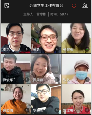 会上,各年级辅导员及兼职辅导员就近期开展的工作分别进行了汇报。2016级辅导员张智梅老师着重谈到,2016级学生作为今年的应届毕业生,就业是第一要务,恰逢这次疫情,部分学生已找好的就业单位出现单方面解约情况,张老师对此表示非常担忧,希望相关领导能出面与有关企业进行协调,努力推动毕业生就业工作的有效开展;2017级辅导员李昆老师讲到,近期的工作主要是防疫期间学生日报平安及各学生组织线上活动的有效引导与开展;2018级辅导员尹俊华老师着重强调了发展入党积极分子、发展党员、党员支援社区防疫及线上动员学生入伍等事宜;2019级辅导员罗周燕老师主要谈到了疫情期间学生心理健康教育、受疫情影响的家庭经济困难学生信息统计上报等工作。此外,各兼职辅导员还从各学生组织开展活动、学生线上主题教育、学生疫情防控期间素材收集宣传报道、学生党员发展等方面提出了相关的建议。
