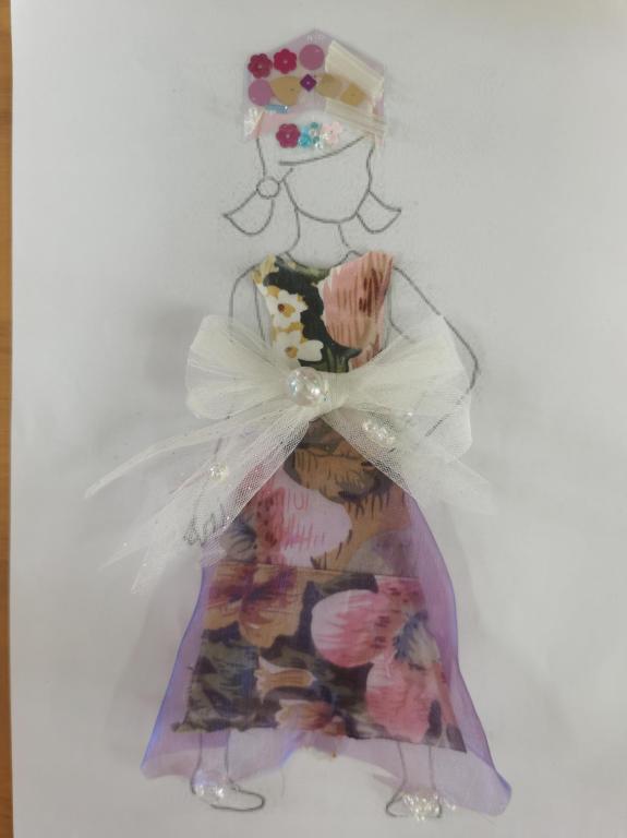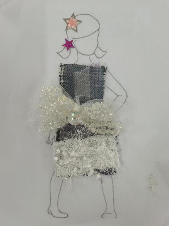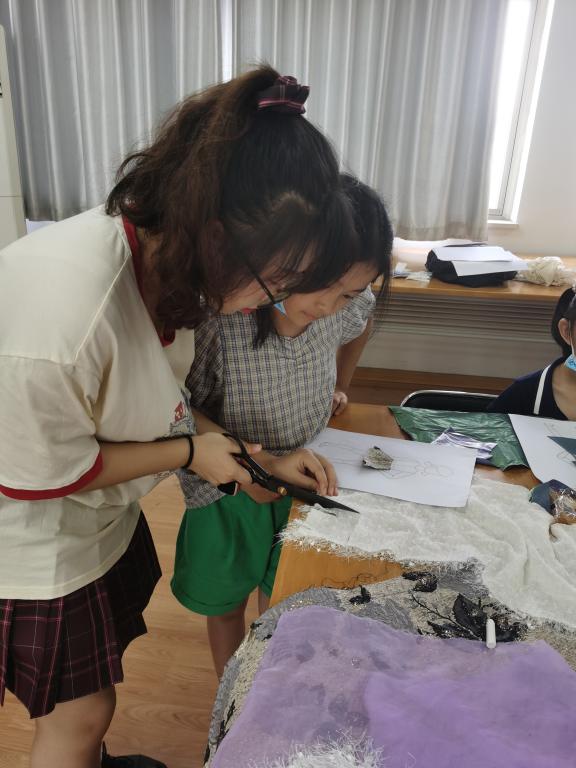参观纺织非遗馆后,小朋友们在志愿者的带领下来到综合楼教室。在志愿者的讲解与的帮助下,小朋友们化身小小设计师,用自己巧妙的构思,在精美的布匹上画好形状,并用剪刀仔细剪下,配合道具的辅助一齐贴在人体图上,形成一幅幅精美的时装画。课堂结束之前,小朋友们讲述了自己的创意与构思,领取了精美礼品,在欢乐的氛围中体验了服装设计与搭配。