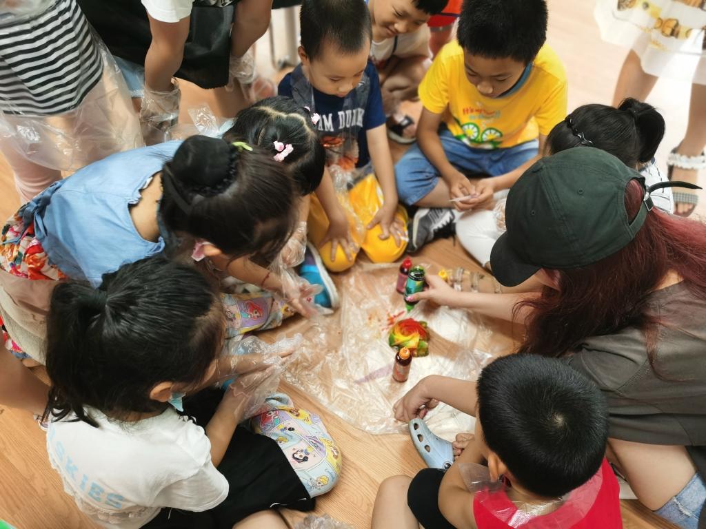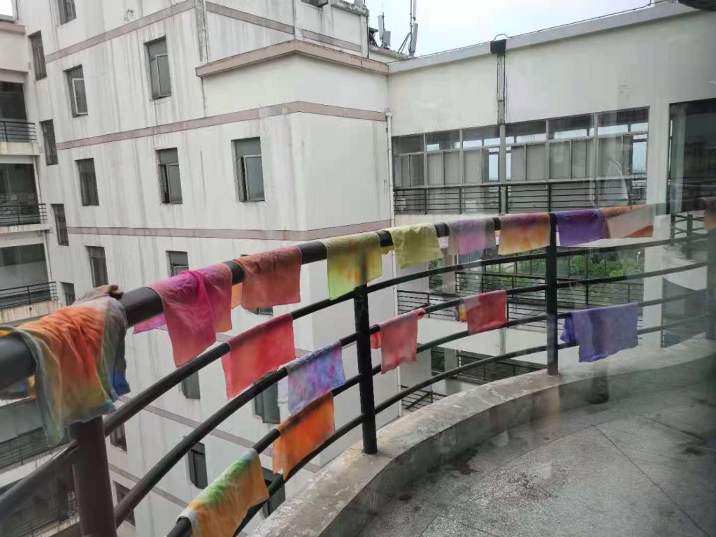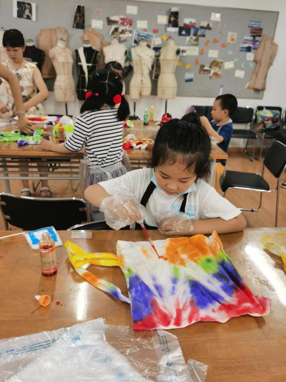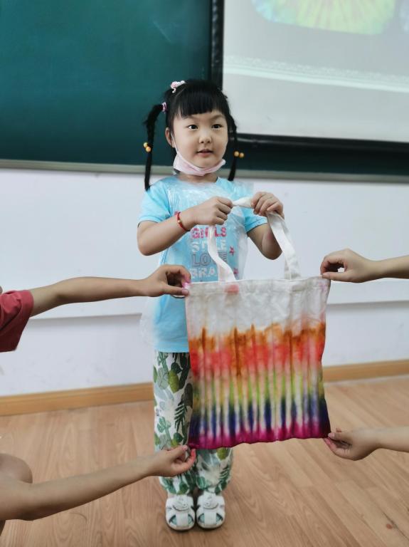 7月8日,“织尚”夏令营第二天,实践团队带领小朋友们体验传统工艺,“邂逅”扎染,实现布里生化。小朋友们根据自己的喜好,在手帕、T恤、帆布包上完成了不同形状、 不同色彩的染色。此课程共完成作品35件,每一件作品都凝聚了小朋友们的想法与创意。活动结束后,作品由小作者们带回,得到了家长的一致好评。