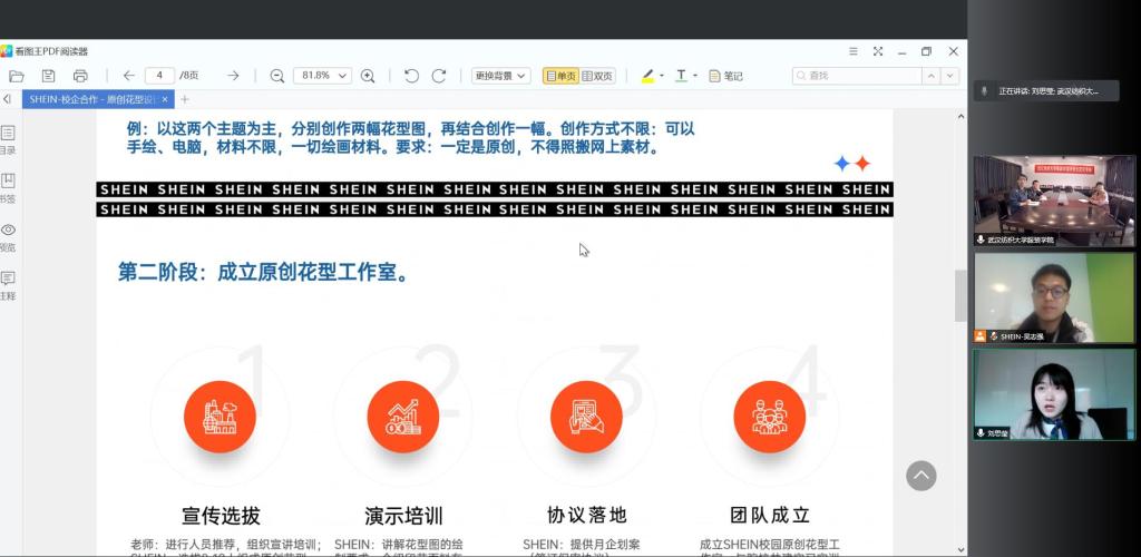 毕业生入职希音,学院的毕业生非常务实,工作表现突出,期待双方就人才培养和产学研方面加强合作共建;希音校企合作项目负责人刘经理就“原创花型工作室”合作项目进行了分享和解读,双方围绕校企合作的具体模式和细节进行了充分交流和探讨。