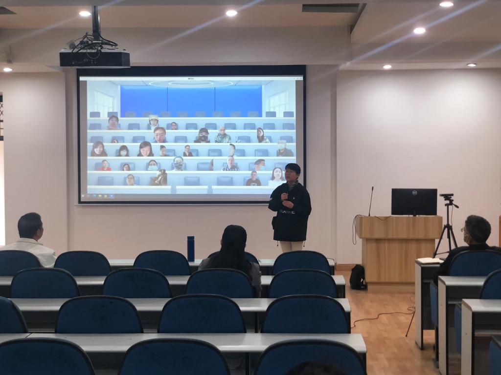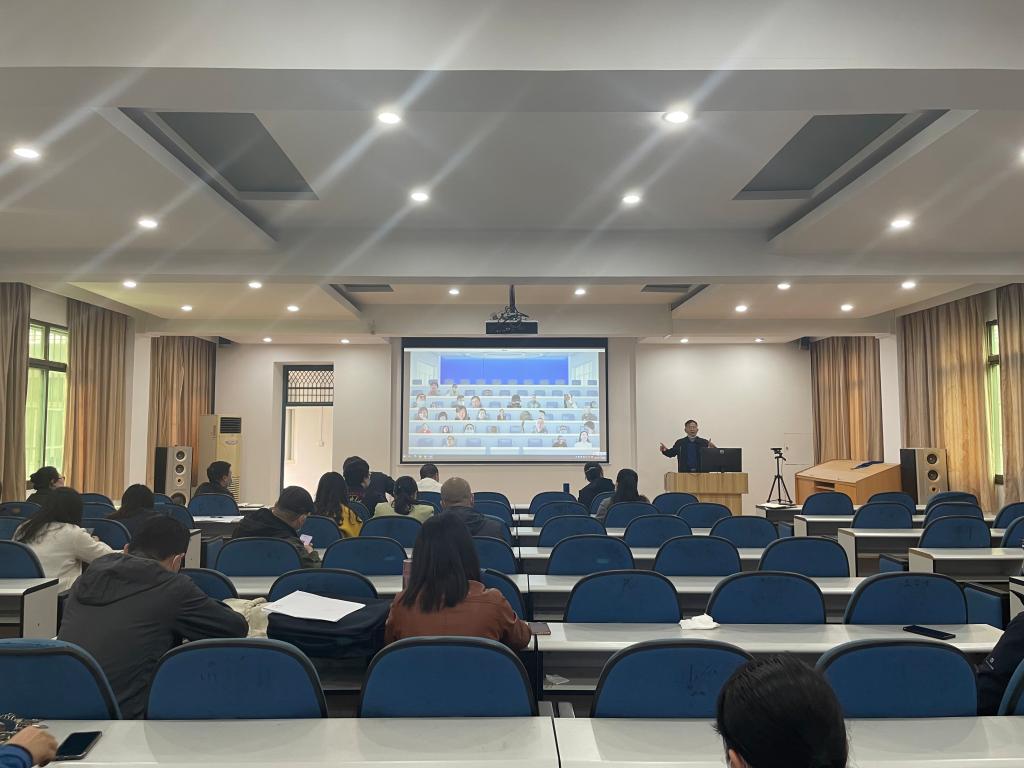 在服装艺术楼201会议室组织召开全体教职工大会。学院班子成员、在校教职工线下参会,其余教职工线上参会。会议由学院院长陶辉主持。