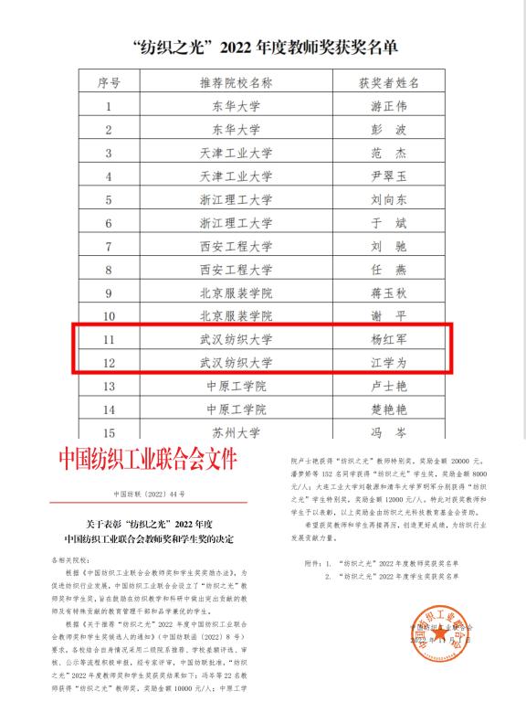 据悉,为促进纺织行业发展,中国纺织工业联合会设立“纺织之光”教师奖,旨在奖励在纺织行业科技进步、提高行业创新能力等方面做出突出贡献的教师,同时影响到更多的教师投身于纺织事业。本年度共评选出“纺织之光”教师奖23名,经过现场专家评审表决,最终评出“纺织之光”教师特别奖1名。