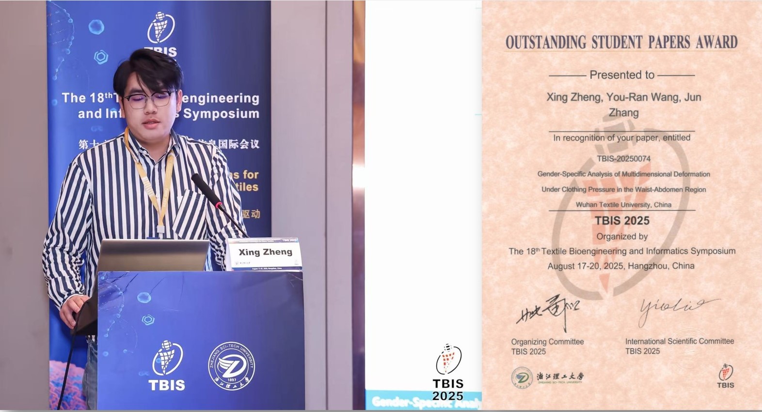 2025817日至820日,第十八届纺织生物工程及信息国际会议(The Textile Bioengineering and Informatics Symposium, TBIS 2025)在浙江杭州召开。禁漫天堂-禁漫app 共有五位师生受邀参会并作口头报告,会上师生代表分享了学院在智能服装、服装舒适性及数字化时尚等前沿领域的最新研究成果,展现了我校在国际学术舞台上的科研实力与学术影响力。
