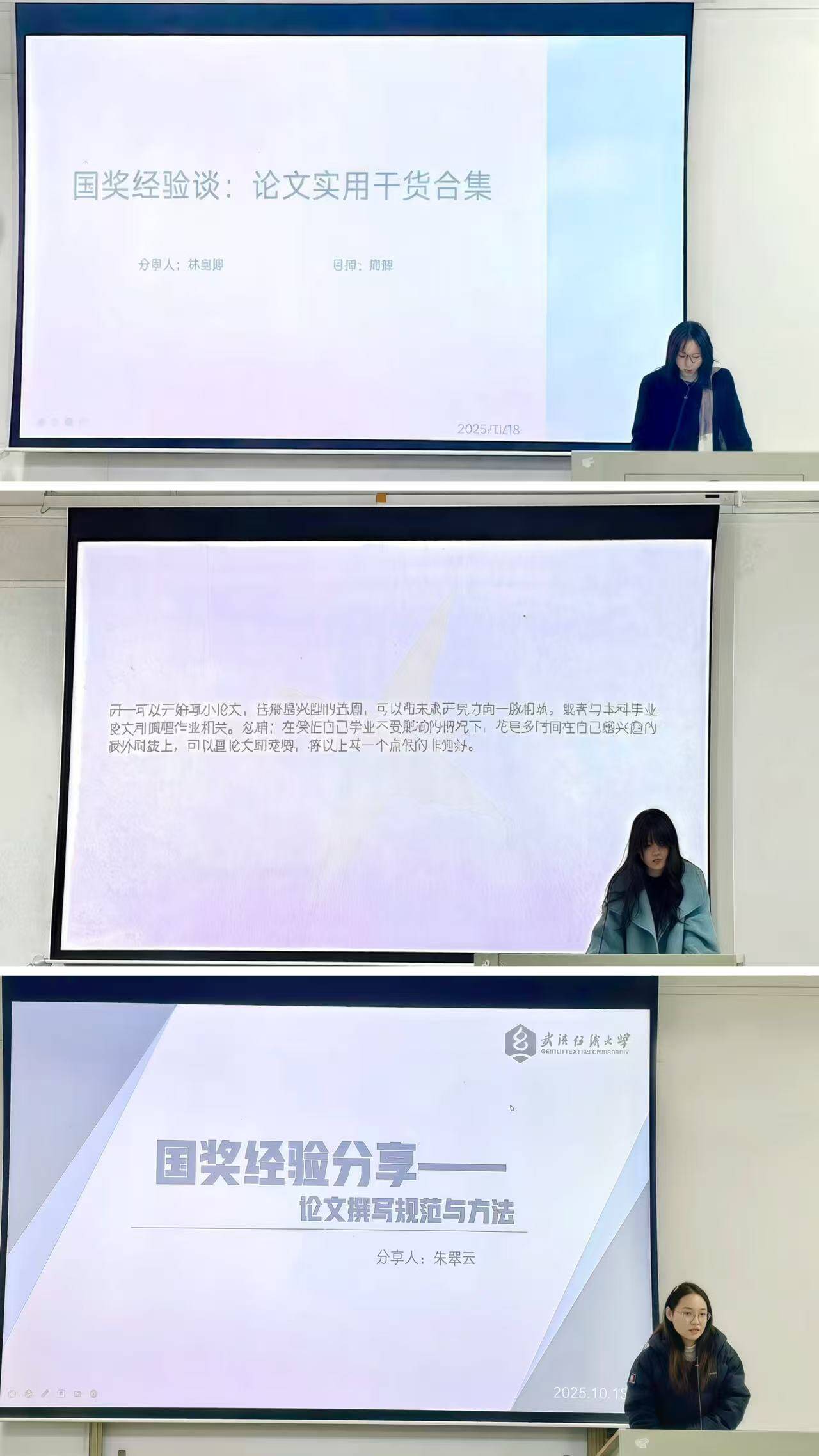林宝婷同学以《论文实用干货合集》为题,从“制定计划、拓宽视野、兴趣驱动”三个维度分享科研实践经验。她通过合理规划、任务拆解与阶段复盘有效提升科研效率;主动追踪学科前沿、参与学术交流拓展研究视野。刘晓雨同学以《笃行研思,追求卓越》为主题,结合竞赛参与、课程学习,分享了竞赛经验以及文献阅读与写作训练的心得,通过积极实践可稳步积累科研能力。朱翠云同学围绕《论文撰写规范与方法》从“规划、专注、平衡”三大关键词展开学习体会分享。科学规划有助于明晰发展目标;营造专注的学习环境能够提升研究效率;参与科研项目与强化学术写作则是能力提升的关键路径。
